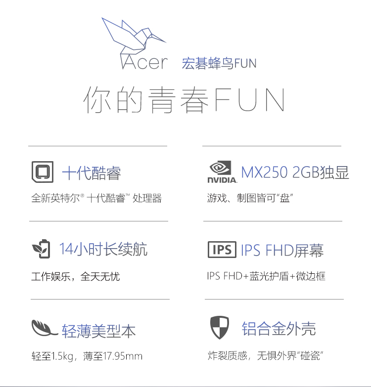 商品名称:宏碁(Acer)蜂鸟FUN微边框 14英寸 十代酷睿 轻薄本 高性能 网课利器 宏基笔记本电脑 (i5-10210U 8G 512GSSD MX250 IPS高清 长续航 wifi6 影音办公)银
