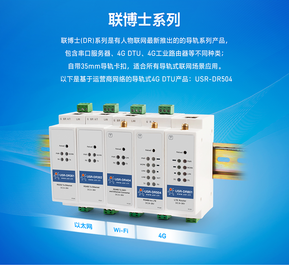 商品名称:工业级导轨式4g dtu无线数据传输设备全网通有人物联网USR-DR504联博士系列 裸机+天线