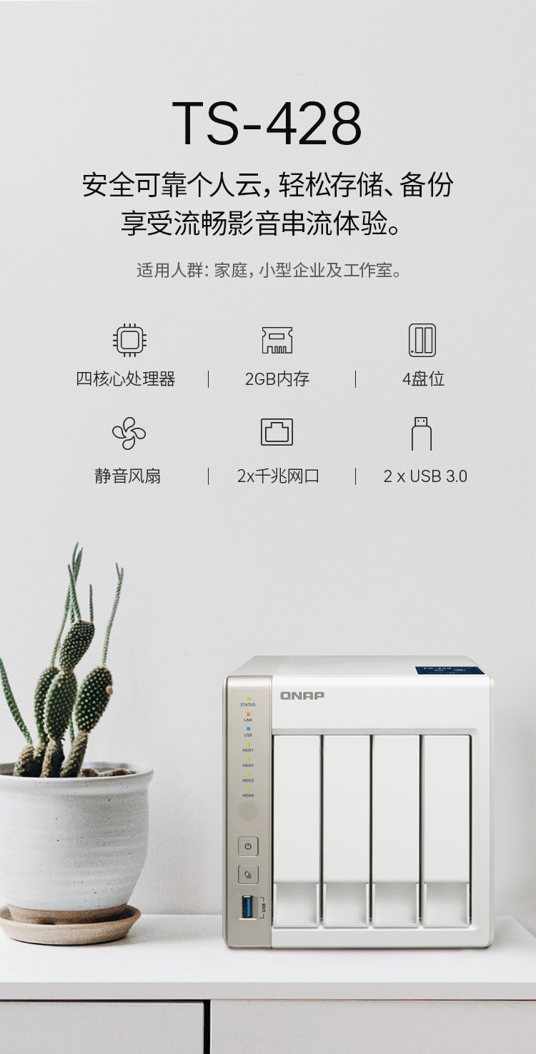 威联通(QNAP)TS-428 2G内存四核心处理器四盘位nas网络存储 磁盘阵列 私有云(无内置硬盘)