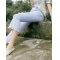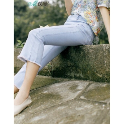 商品名称:茵曼夏装弹性棉牛仔分割毛边显瘦七分喇叭裤女牛仔裤【1872333403】 水蓝色