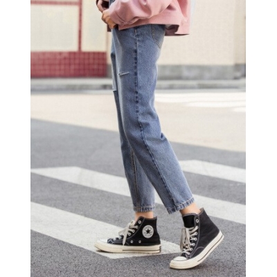 商品名称:茵曼2020春装新款文艺复古纯棉破洞水洗小脚裤牛仔九分裤女【1801716】 牛仔蓝