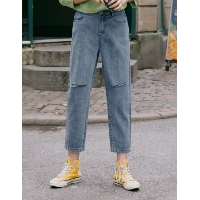 商品名称:茵曼2020春装新款纯棉文艺复古破洞直筒宽松时尚个性牛仔裤女【1801010】 牛仔蓝