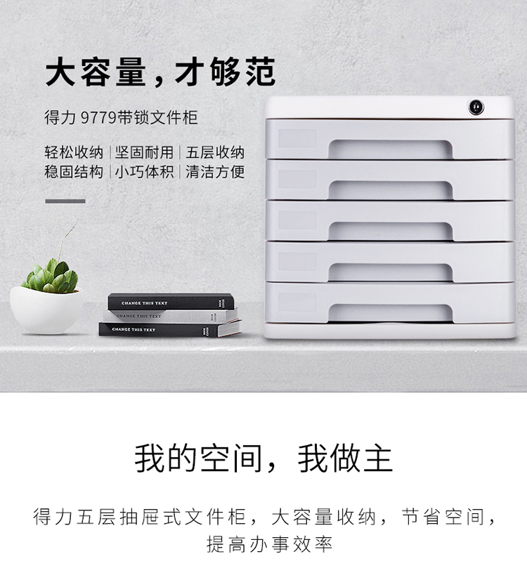 得力(deli)5层带锁手拉桌面文件柜 带索引标签抽屉资料收纳柜 办公用品 浅灰色9779