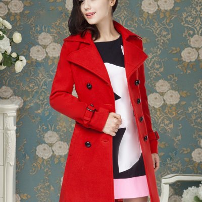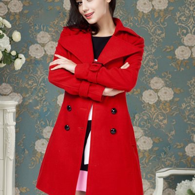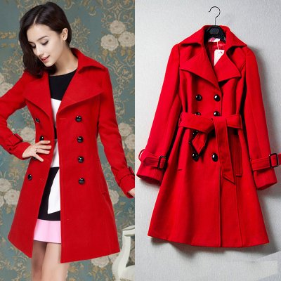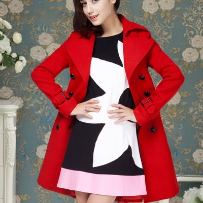 商品名称:韩文2015冬装新款女装红色双排扣配腰带毛呢大衣.