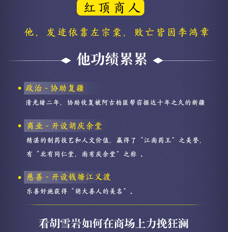 考察胡雪岩的发家轨迹,研究胡雪岩做生意的策略和方法,便可发现 他的成功绝非偶然。胡雪岩的头脑“诡计多端”,经商手腕灵活善变,用 人的手法高人一筹。他善于在钱眼里翻跟头,对钱财看得开,胸襟开阔, 手笔恢宏,胆识过人……总之,胡雪岩的素质和天赋,非一般商人所能企 及。他很好地利用了自己的素质和天赋,做出了大手笔的生意,成就了大 商人的事业。