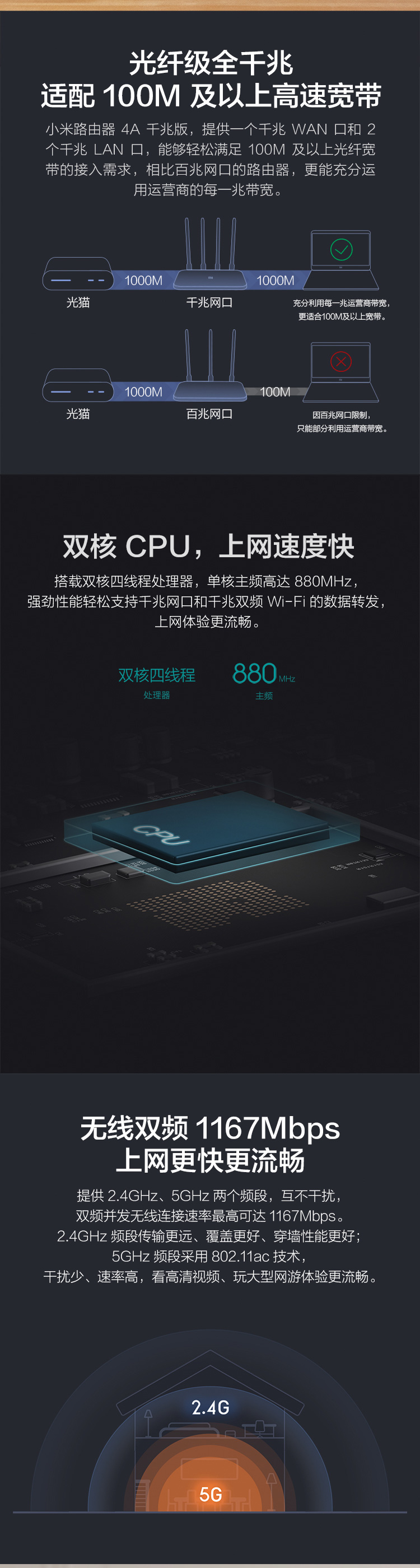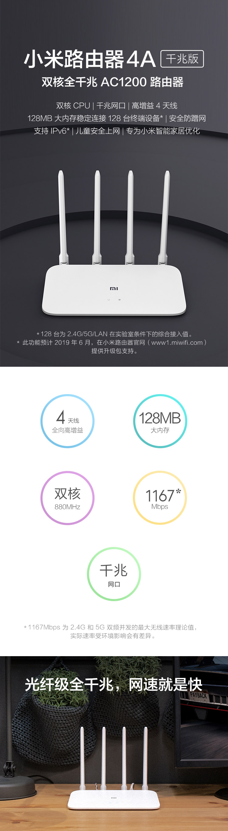 商品名称:小米路由器4A千兆版 双核CPU 双千兆 1200M双频无线速率 5G 家用智能路由器 四天线穿墙 双频合一 光纤适用