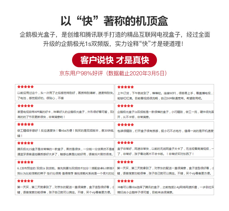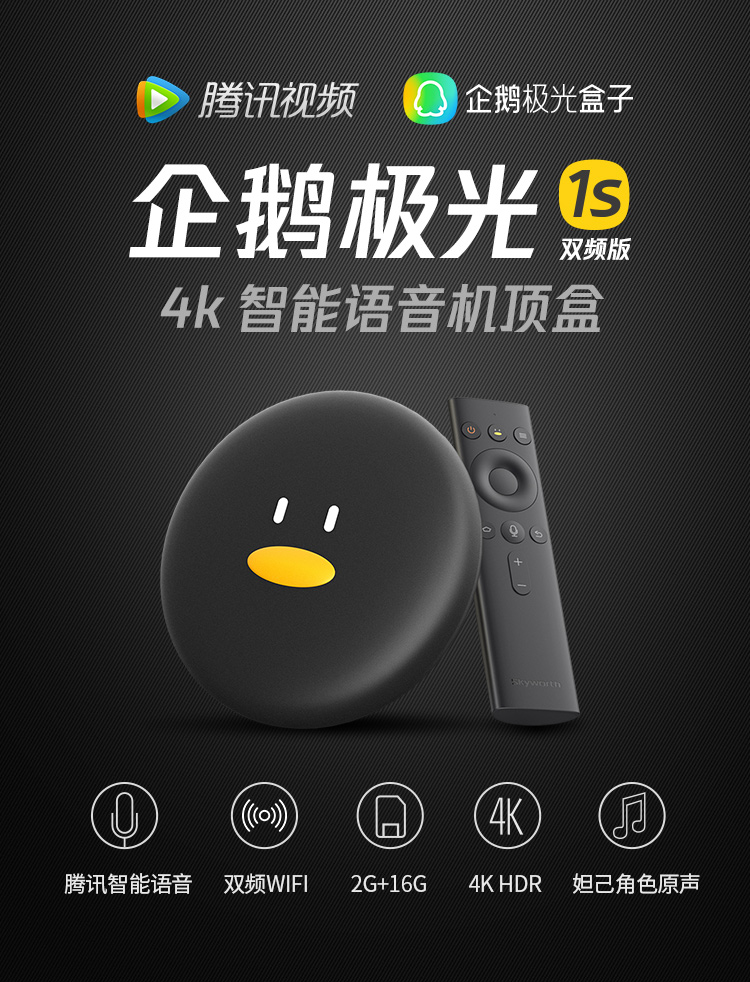 商品名称:腾讯企鹅极光盒子1s双频版 网络电视机顶盒 4K高清HDR智能语音 2+16G大存储 2.4G/5G双频wifi