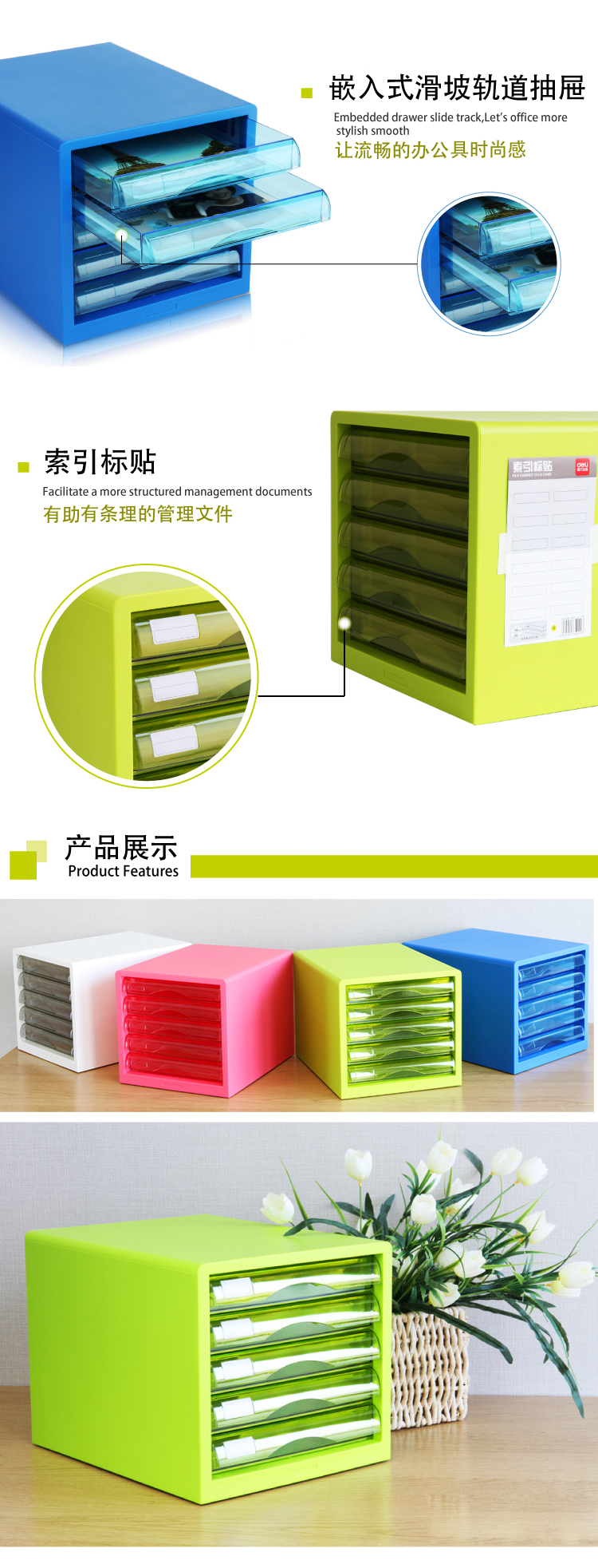 商品名称:得力(deli)5层彩色时尚桌面文件柜 A4资料收纳柜 带索引标签 办公用品 象牙白9777